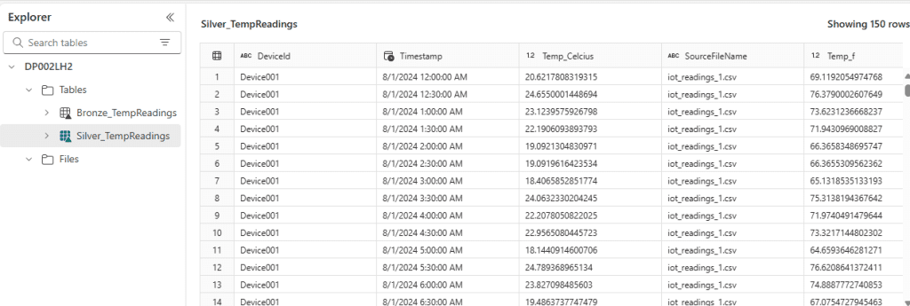 Load the transformed data into a new table Silver_TempReadings In same lake house